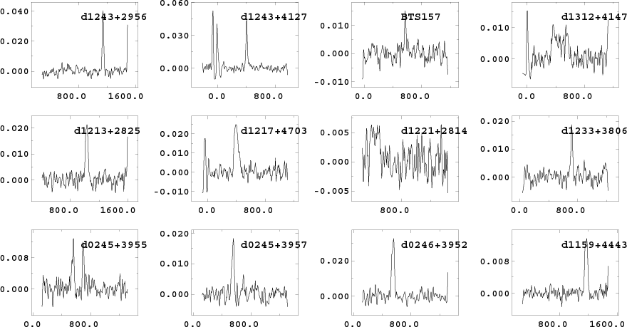 Figure 1: a) HI profiles of the 12 dwarf galaxies detected in the Effelsberg observations from the first observational run with the AK1024, with a pencil beam of half-power beamwidth of 9.3 arcmin at 21-cm. All these galaxies have been detected for the first time. Profiles are arranged in an increasing order of right ascension, starting at the bottom left corner. (see Table 1). The axes are labelled in Jansky (Jy) and in heliocentric radial velocity in km s-1. |