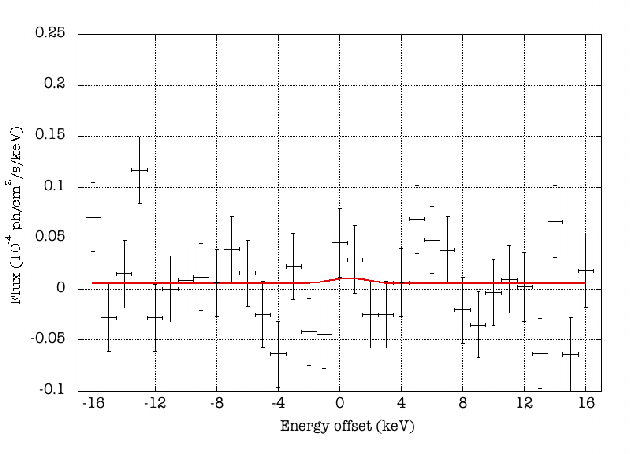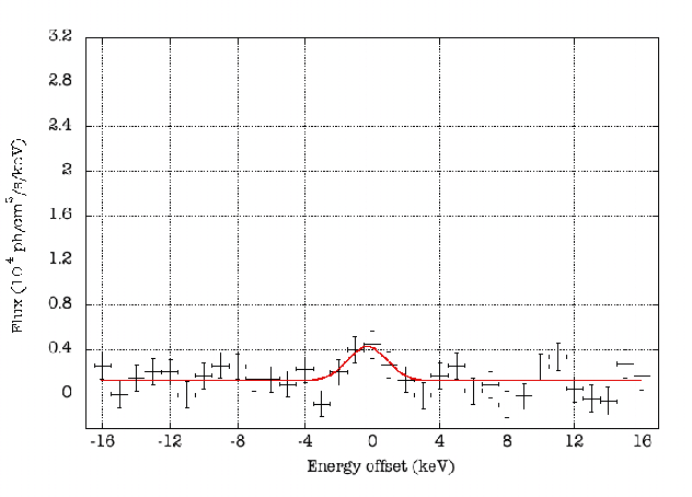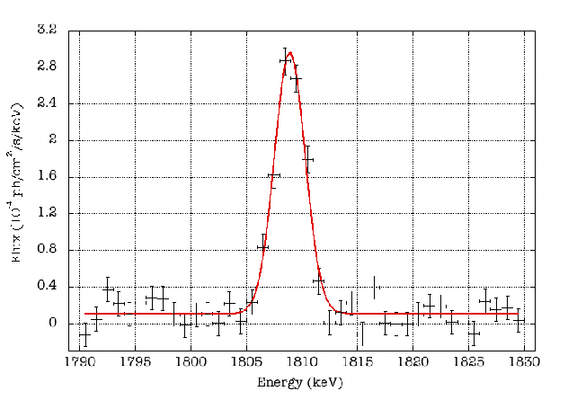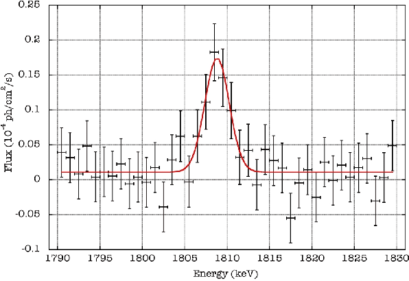 Figure 3: Spectrum of the 1809 keV emission from the Galaxy (Sco-Cen and Cygnus regions excluded), from about 4 years of INTEGRAL/SPI observations. The red line represents the best Gaussian fit to the data points. |