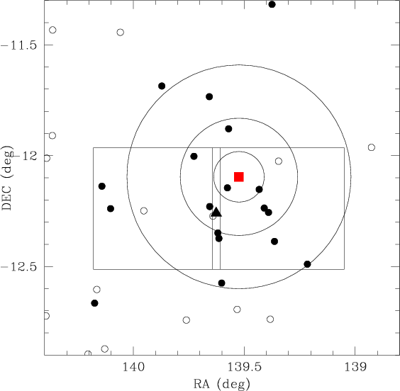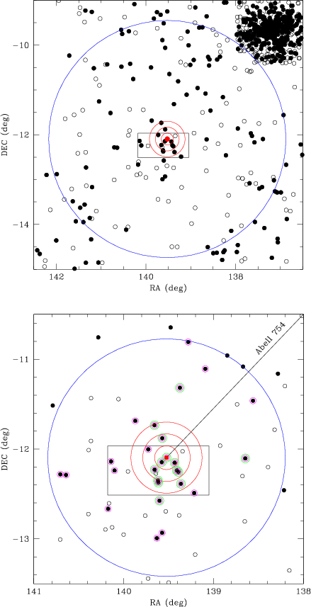 Figure 10: Positions of the galaxies with measured redshifts and magnitudes in a large-scale region around Abell 780, taken from NED. Small filled black circles show galaxies with redshifts in the [0.0338, 0.0738] redshift interval, while empty circles show galaxies with redshifts outside this range. The black rectangle indicates the total field covered by our images. The red filled square corresponds to the cluster centre as defined in the text. The three small red concentric circles correspond to radii of 0.5, 1.0, and 1.5 Mpc. Top figure: the large blue circle corresponds to a radius of 10.0 Mpc. The Abell 754 cluster is visible at the top right. Bottom figure: zoom of the top figure, with the large blue circle having a radius 5.0 Mpc. The 27 galaxies circled in magenta and the 14 galaxies circled in green correspond to the two gravitationally bound structures according to the Serna-Gerbal analysis. The line indicates the direction towards Abell 754. |