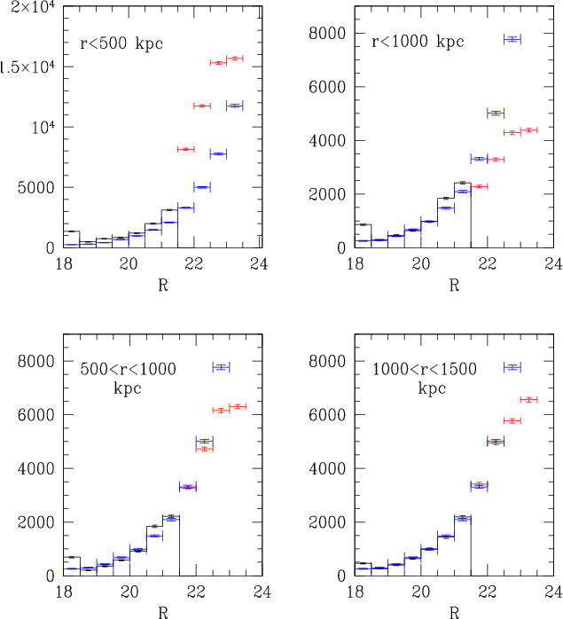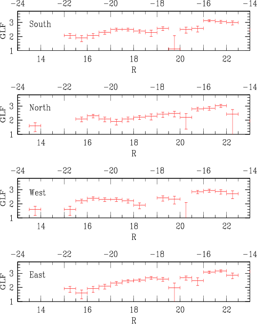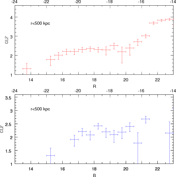 Results. In a region of 500 kpc radius around the cluster center, the GLF in the R band