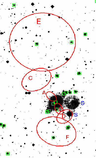 Abell 780 is well known in X-rays under the name of Hydra A, originating from the cluster cD being a strong radio emitting galaxy bearing this name. Based on a deep Chandra image, Wise et al. (2007) found several X-ray cavities (labeled A to F) in the central region, which they explained by outflow (continuous or in bursts) from the nucleus of the central galaxy. The cavities could each harbor one or several AGN (expected to be intrinsically bright and to have bluer colours than normal galaxies). The optical R band image around the cluster centre is shown in Fig. 9 with the positions of the X-ray cavities from Wise et al. superimposed. Cavities A and B are partly superimposed on the cD, and SExtractor detects several galaxies brighter than R = 18superimposed on the cD (but slightly outside A and B). No bright galaxy is visible in cavities C and D. Cavity E contains two objects brighter than R = 18, but one of them is probably a star (a weak diffraction cross is visible when carefully looking at the image). Cavity F has two bright galaxies with R mag 16.2 and 16.8; the brighter one has a redshift z = 0.051526 according to NED, but all three galaxies in cavities E and F have normal B-R colours, so either spectroscopy or high-resolution multiband imaging (to search for blue cores) are necessary to check that they are AGN. To our knowledge they have no X-ray or radio counterparts.