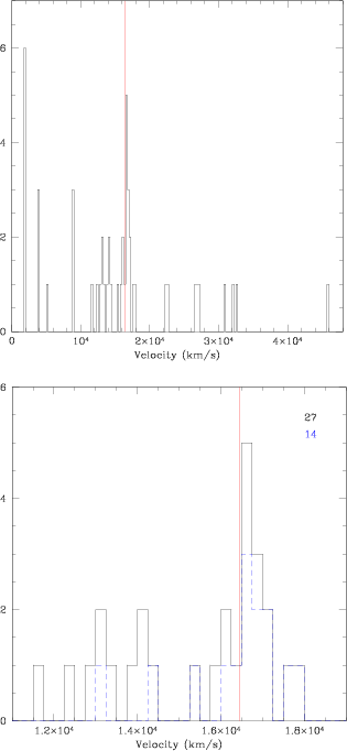 (Fig. 10). The velocity histogram of these 27 galaxies is displayed in Fig. 11 (bottom), together
