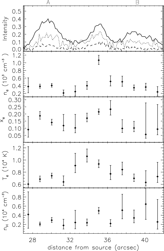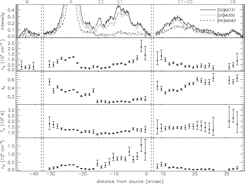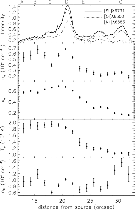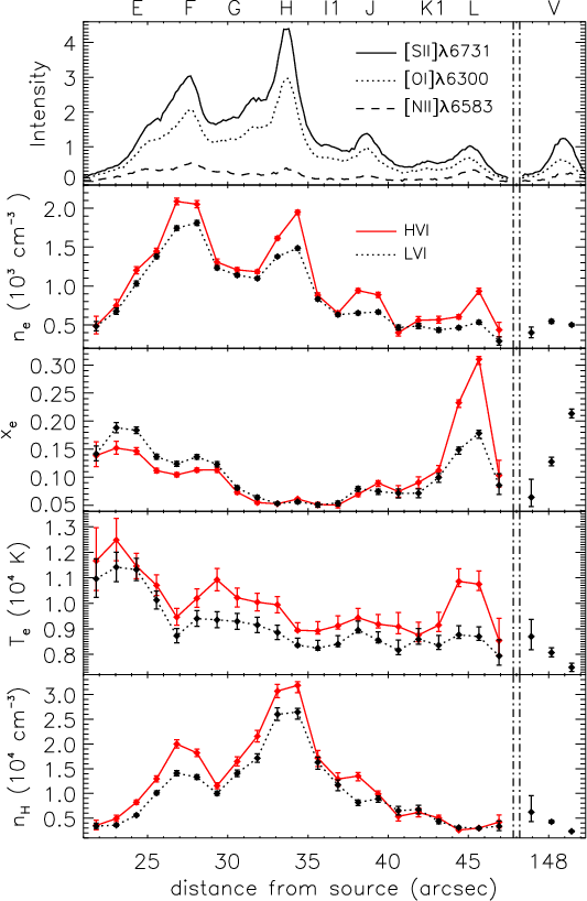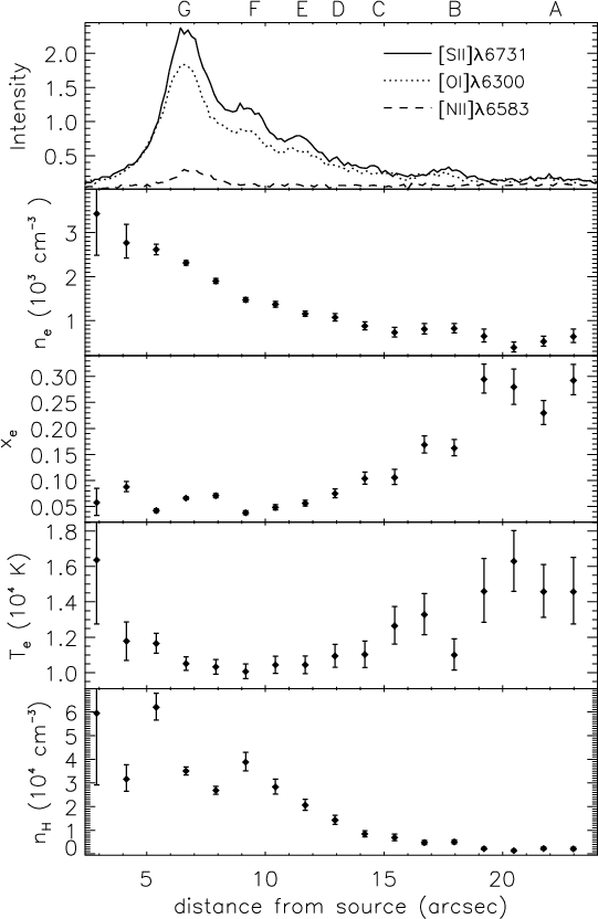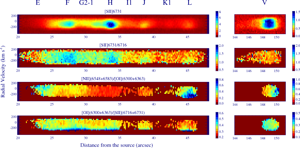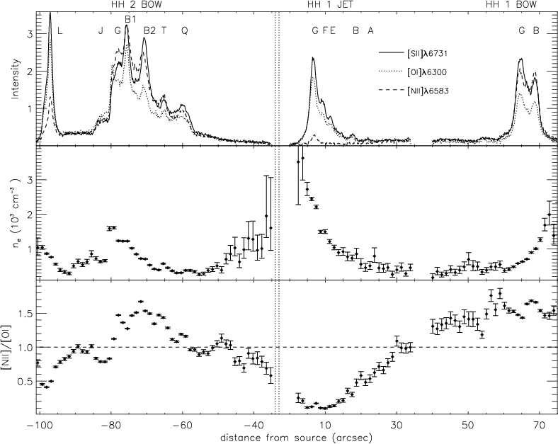 We could not apply the diagnostic to the terminal bows. The BE technique, in fact, relies on the assumption of low excitation conditions, i.e. S being totally ionised but there is no S++, and oxygen and nitrogen are ionised at most once (Bacciotti & Eislöffel 1999). This assumption is satisfied for the jet where gas interacts with material already in motion from previous outflow events, but may not be correct when dealing with the terminal bows. This picture is confirmed by proper motions studies by Bally et al. (2002) which indicate shock velocities lower than 30 km s-1 in the jet and velocity jumps of up to 100-200 km s-1 in the bows. Moreover, Böhm & Solf (1985) and Solf et al. (1988) detected many high excitation lines in HH 1 and HH 2 such as O++, S++, and Ar+++.