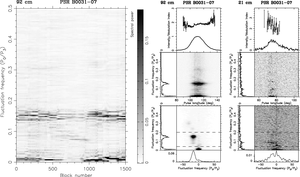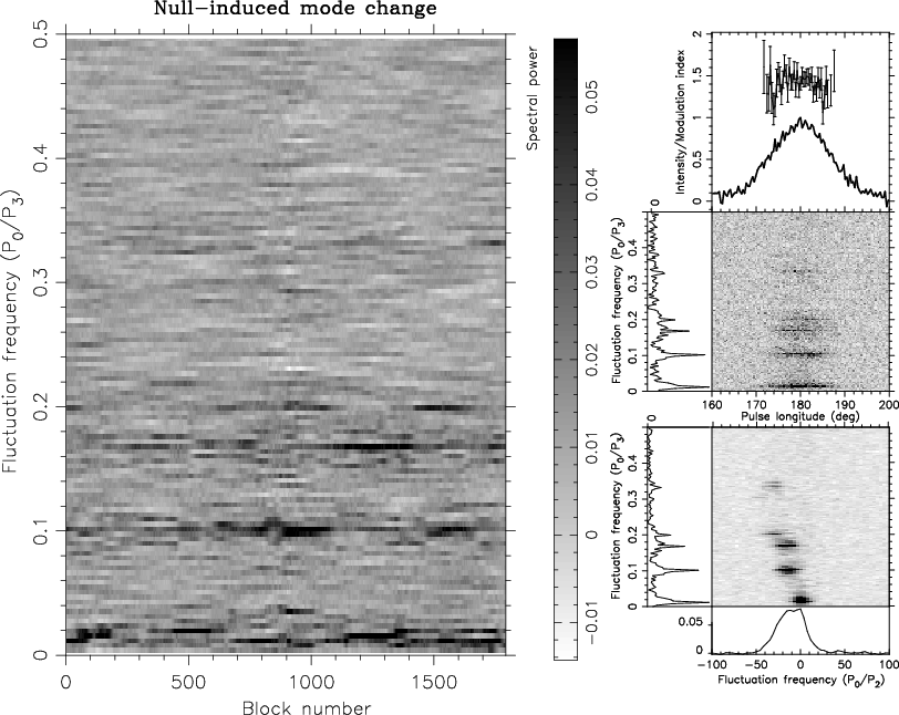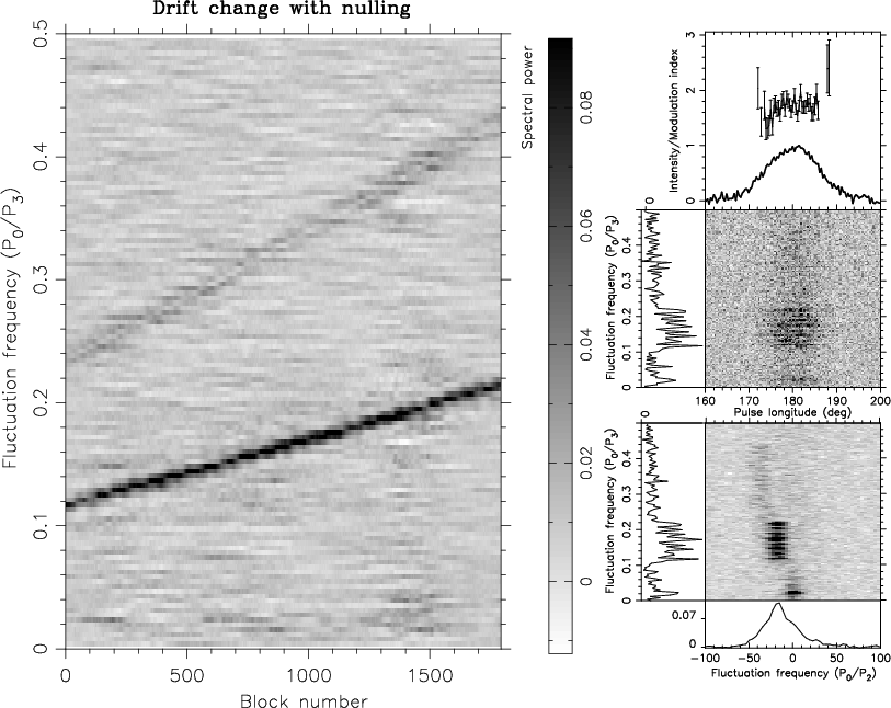 One can easily see that between block 3100 and 3150 there is a region where power in the S2DFS plot is dominated by fluctuations across the whole P0/P3 range. The visual inspection of the pulse stack revealed the presence of a group of pulses, which did not show any particular organised order, in between two long nulls disrupting the ``A''-mode drift. We interpret this as follows: The DFT window sliding through the long null, enclosed the group of pulses, and thus produced fluctuations across the P0/P3 range in the collapsed fluctuation spectra. One can also see that after block 3500 the low-frequency feature decreases its spectral power. We explain that as being caused by similar behaviour as in PSR B0031-07.