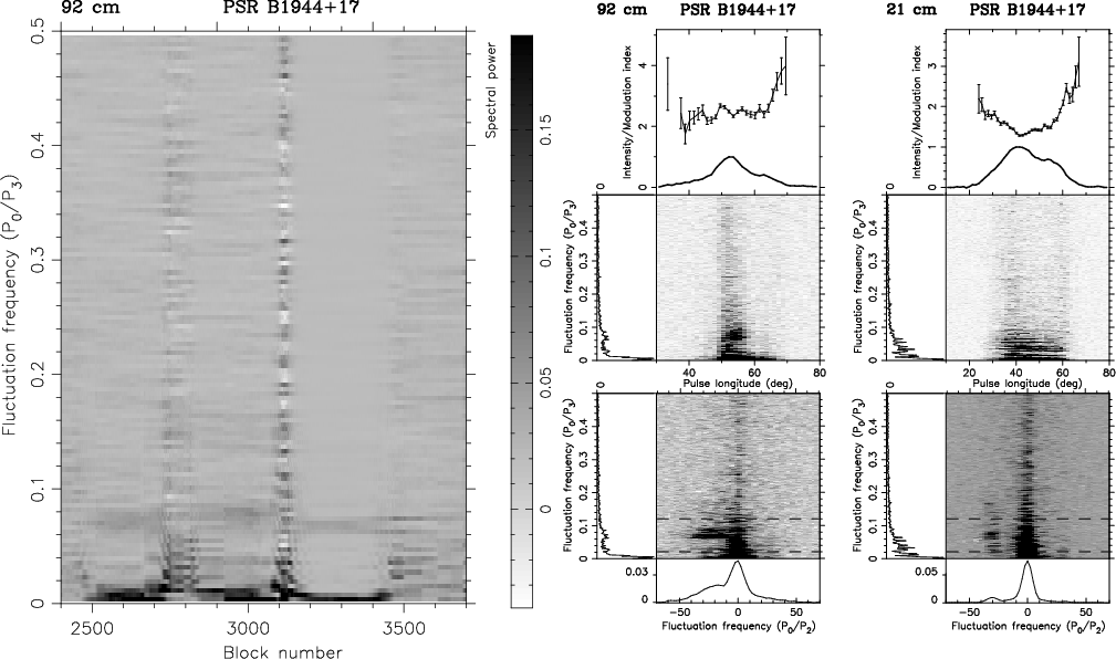 The results from the S2DFS analysis for both wavelengths showed the presence of tracks in the S2DFS plot revealing the presence of the aforementioned drift mode. The sparse occurrence and very short duration times of the tracks (of the order of one hundred blocks) were caused by the frequent occurrence of nulls disrupting the drift bands. In the left-hand plot of Fig. 7 we show the S2DFS plot of 1300 out of 3735 blocks with the most prominent example of tracks denoting ``A''-mode drift present at 92 cm.