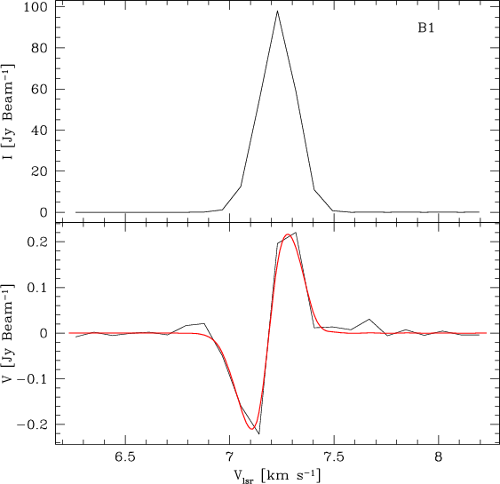 Zeeman-splitting was detected in 3 of 10 maser features (A4, A5, and B1). Figure 2 shows the total intensity and the circular polarization spectrum for the brightest feature. Columns 9 and 10 of Table 1 contain the Zeeman-splitting in m s-1 and the magnetic field strength along the line of sight, which were determined from the cross-correlation between the RR and LL spectra. B|| was derived using a Zeeman-splitting coefficient of 0.049 km s-1