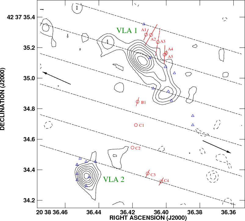 Positions of methanol and water masers superimposed on the 1.3 cm continuum contour map of the VLA1 thermal jet and VLA 2 (Torrelles et al. 1997). Contours are -3, -2, 2, 3, 4, 5, 6, 7, 8 |