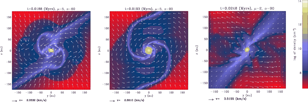 Another important point is that while in the purely hydrodynamical case, and for the cloud parameters used, fragmentation occurs; we do not identify fragmentation in any of themagnetized cases explored. It is however possible that with a better treatment of the thermal processes, the magnetized disks which form in the low magnetized configurations, may also fragment.