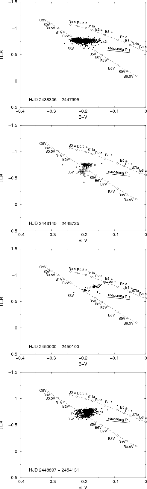 - Station 01 - Hvar: These observations were reduced to the standard UBV system via non-linear transformation formulæ using the HEC22 reduction program - see Harmanec et al. (1994) and Harmanec & Horn (1998). The first part of them was secured in the course of the international campaign on photometry of Be stars (Harmanec et al. 1982) and has already been analyzed by Pavlovski et al. (1997), Pavlovski & Bozic (1982) and by Bozic & Pavlovski (1988) and published in detail by Harmanec et al. (1997). The 1999-2007 observations are published and analyzed for the first time here. Observations since 2000 were reduced with a more sophisticated HEC22 rel.16 program which can also model time variation of linear extinction coefficients in the course of observing nights.
