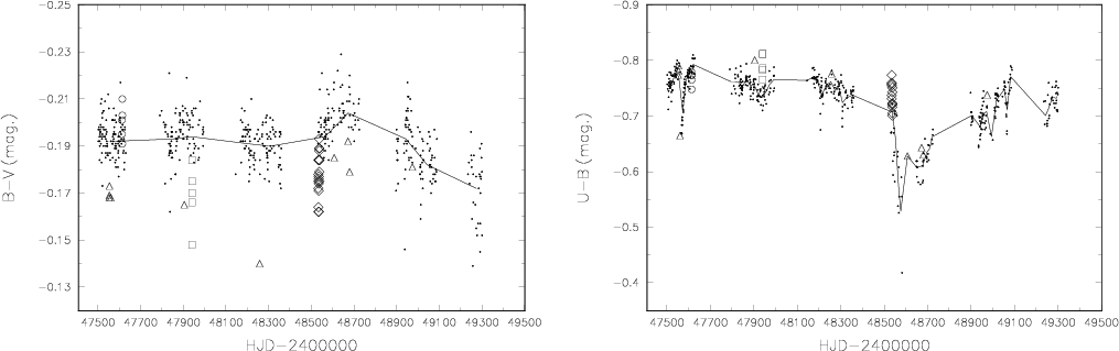 standard V and B magnitudes via the transformation formulæ derived by Harmanec (1998). Since the star underwent long-term colour variations