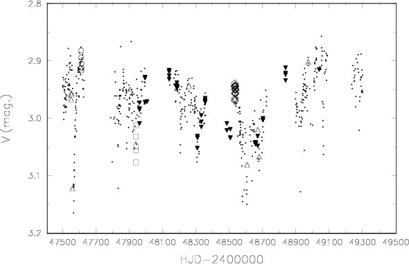 magnitudes transformed to Johnson V are shown by black triangles down. See the text for the details.