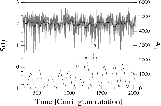 (black-red-yellow) is proportional to the sunspot area that is plotted as a function of time (Carrington rotation number