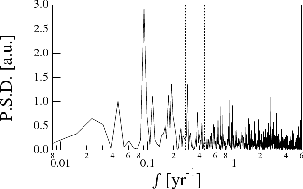 Using the temporal and latitudinal distribution of sunspots recorded since 1874, it was proposed (Mininni et al. 2002) that the solar magnetic cycle, investigated by means of the butterfly diagram, might be interpreted as being the result of the superposition of two oscillations, characterized by constant amplitude and phase and by a period close to 22 years, on a stochastic background. This suggested that the spatio-temporal irregularities observed in the solar magnetic cycle were not a plain manifestation of low-dimensional chaos being due to the interaction of two superposed antisymmetric modes with a stochastic background (Mininni et al. 2002,2004). Similar results were found by Lawrence et al. (2005), who investigated the 22 year solar cycle by NSO Kitt Peak synoptic maps, and by Vecchio et al. (2005), who studied the spatio-temporal features of 11-year solar activity using the green coronal emission line at 530.3 nm. In contrast, Letellier et al. (2006) showed that the 22-year solar magnetic cycle, as reconstructed by sunspot time series, is in agreement with a low-dimensional chaotic dynamics. In detail, they showed that the phase-space diagram (the phase portrait) of the sunspot number resembles that of a Rössler dynamical system.