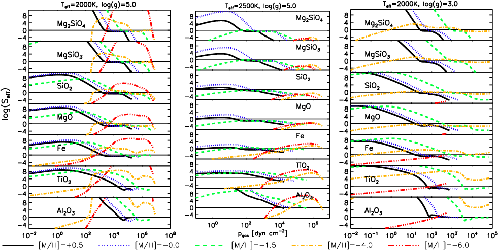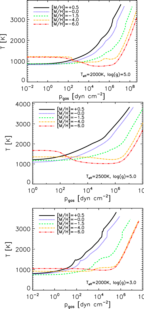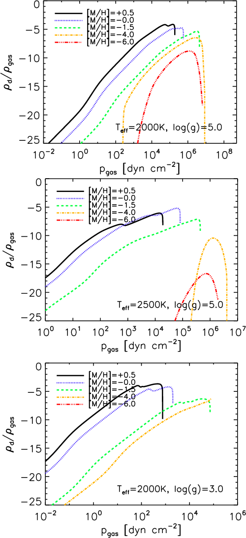 The dust clouds in our models are shifted inwards for decreasing effective temperature, increasing surface gravity and decreasing metallicity. This shift is responsible for the continuing strong presence of the clouds, as it yields a higher gas density, which is in parts able to compensate for the decreasing metal abundances with [M/H]. Therefore, the maximum dust content in our models does not linearly scale with the metallicity, but decreases slower than might be expected.