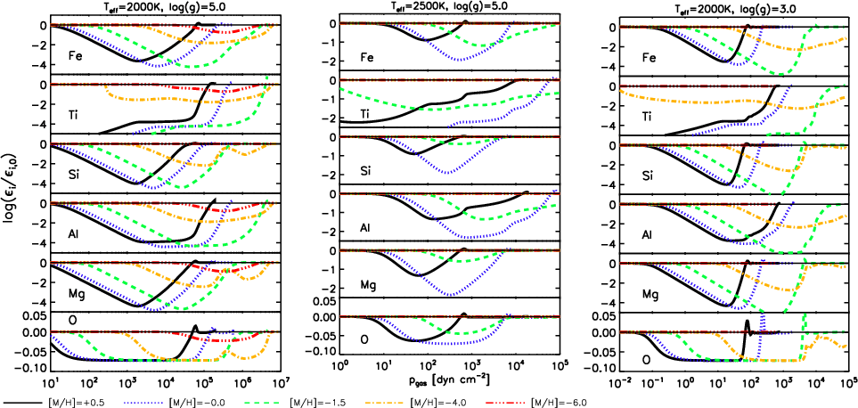 The gas phase at the dust clouds is typically strongly depleted. In all three model sequences we find a metallicity value for which this depletion compared to the deep interior model abundances reaches a maximum. For higher and lower metallicities of the same sequence, the depletion is less strong. Because of the strong depletion, which is already present at the upper, optically thin cloud, it is risky to determine element abundances from absorption lines, as the visible abundances may not reflect the deep interior value.