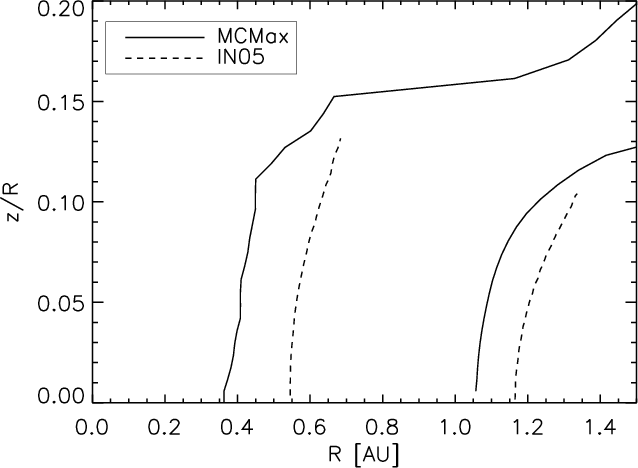 Monte Carlo radiative transfer has been used to extend the IN05 models to two grain sizes in thermal contact (Tannirkulam et al. 2007). It was shown that grain growth, specifically the presence of grains of different sizes and settling of large grains, strongly curves the inner rim. A comparison with these results is made in Sect. 5.