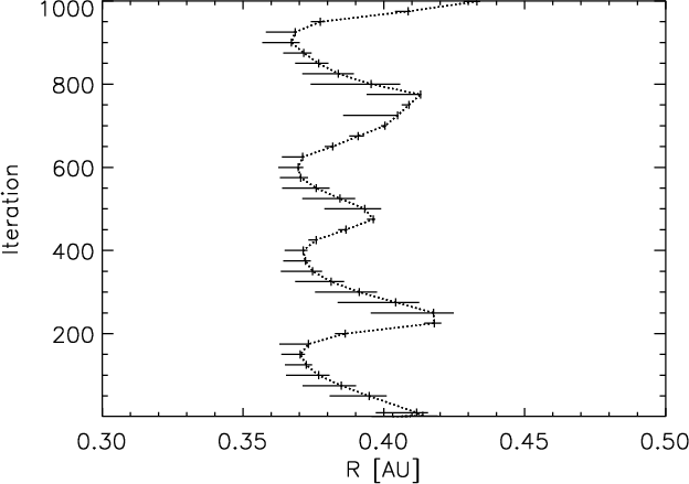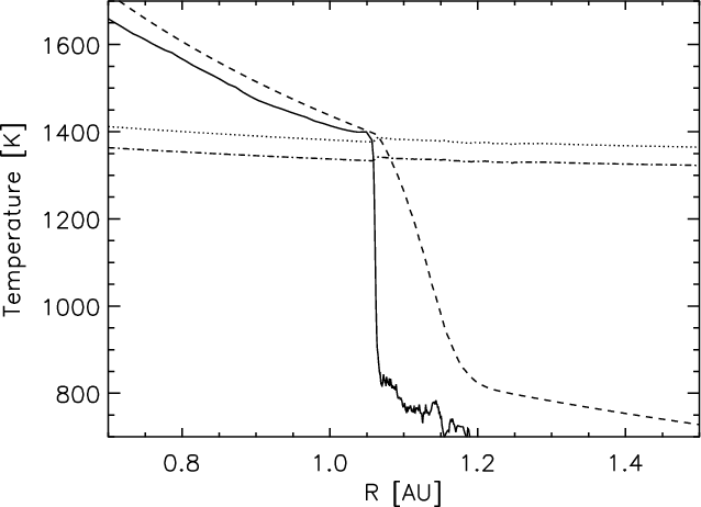 Another problem which might arise from the iterative procedure explained above is that the destruction of dust proceeds faster in the region which is effectively backwarmed than in the optically thin region in front of it. This might cause the fraction of condensed material to decrease with increasing radius. This solution turns out to be unstable, and in addition we consider it to be an unlikely physical solution. Thus, to avoid this we restrict the gas fraction to be monotonously decreasing with increasing radius.