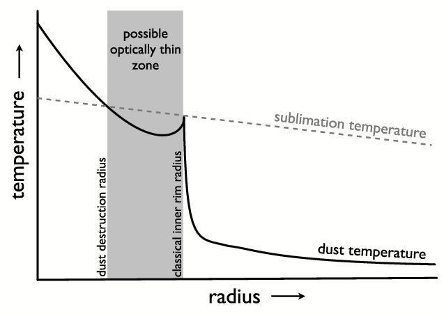 Meanwhile, the physico-chemical parameter space of dust rim models has been little explored in terms of variations in global inner disc properties (surface density profile, composition) and dust type (astronomical silicate has been the standard opacity and homogeneous spheres the particle shape). The complex geometry and high optical depth of protoplanetary discs can now be studied with fast Monte Carlo radiative transfer codes (Min et al. 2009), providing further incentive to incorporate more detailed physics to clarify the limits of dusty rim models.