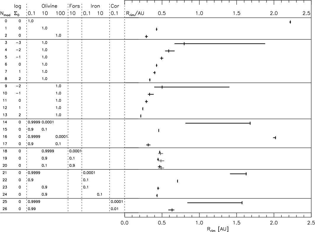 required astronomical silicate grains of m size. However, the modelled rim radii were larger than those obtained by Eisner et al. (2004) by up to a factor of three, and simultaneously fitting the SED and rim radius of AB Aur was unsuccessful.