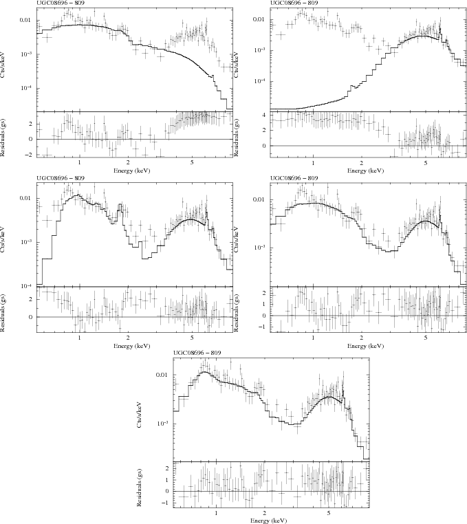 Figure E.32: Spectral fits of UGC08696. (Top-left): Thermal model (MEKAL), (Top-right): Power-law model, (Center-left): Power-law plus thermal model, (Center-right): Two power-law model, (Bottom): Two power-law plus thermal model. |