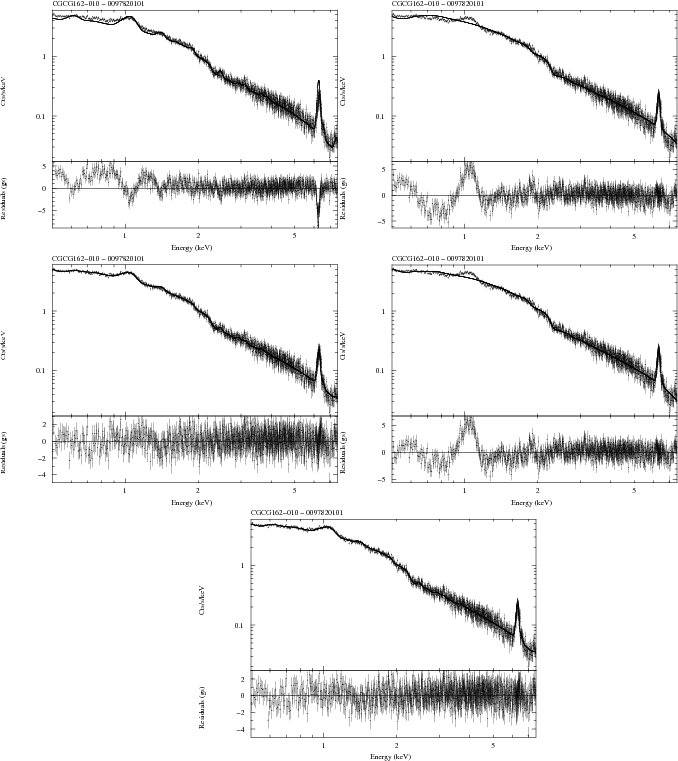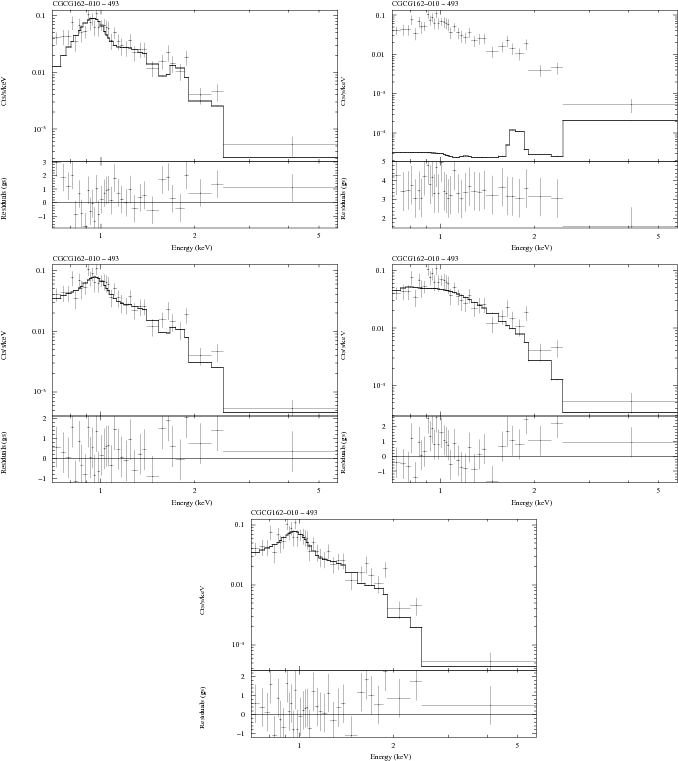 Figure E.33: Spectral fits of CGCG162-010. (Top-left): Thermal model (MEKAL), (Top-right): Power-law model, (Center-left): Power-law plus thermal model, (Center-right): Two power-law model, (Bottom): Two power-law plus thermal model. |