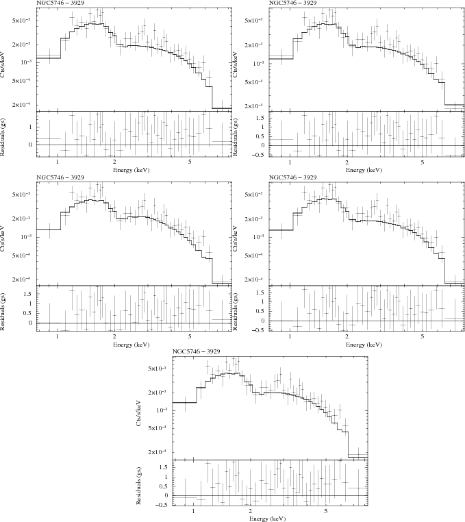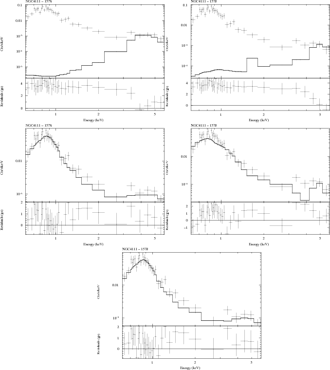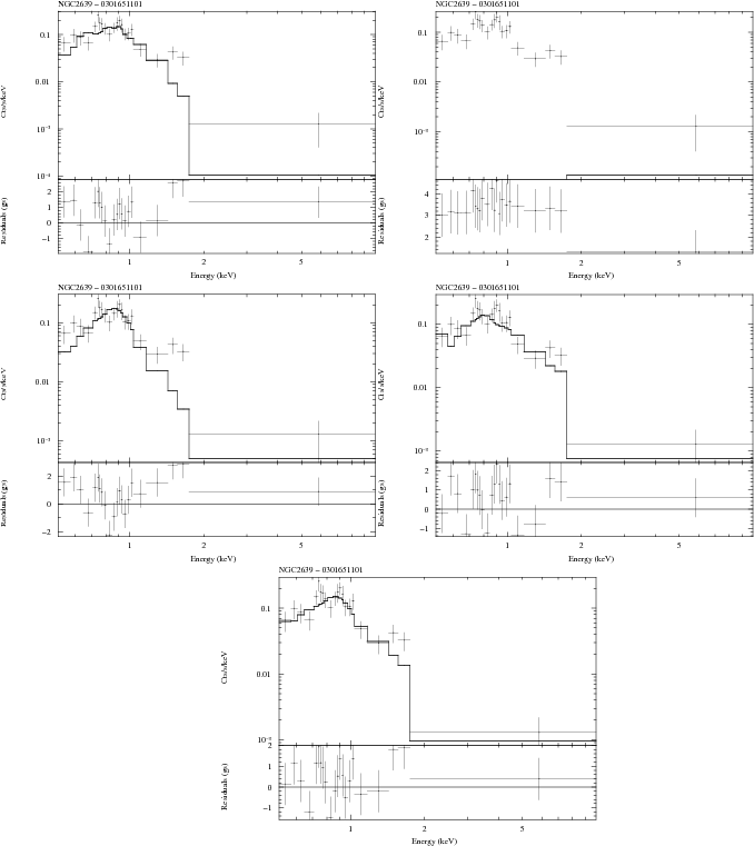 Figure E.5: Spectral fits of NGC2639. (Top-left): Thermal model (MEKAL), (Top-right): Power-law model, (Center-left): Power-law plus thermal model, (Center-right): Two power-law model, (Bottom): Two power-law plus thermal model. |