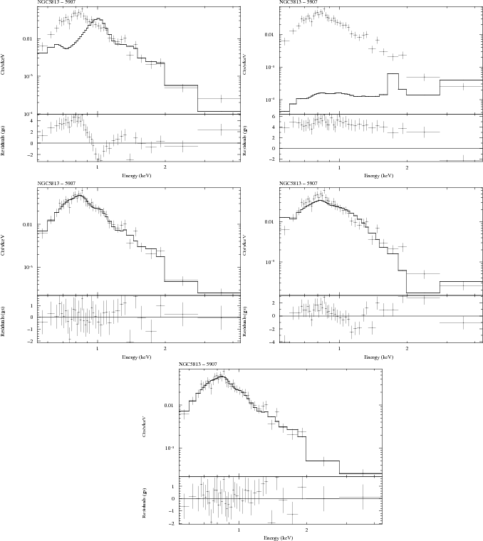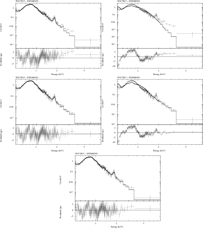 Figure E.37: Spectral fits of NGC5813. (Top-left): Thermal model (MEKAL), (Top-right): Power-law model, (Center-left): Power-law plus thermal model, (Center-right): Two power-law model, (Bottom): Two power-law plus thermal model. |