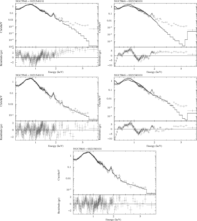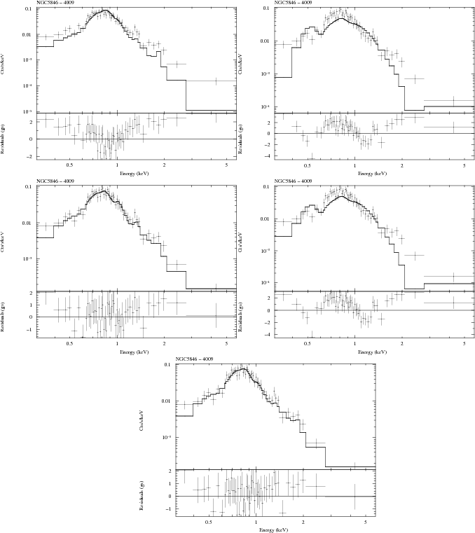 Figure E.38: Spectral fits of NGC5846. (Top-left): Thermal model (MEKAL), (Top-right): Power-law model, (Center-left): Power-law plus thermal model, (Center-right): Two power-law model, (Bottom): Two power-law plus thermal model. |
