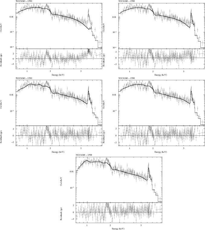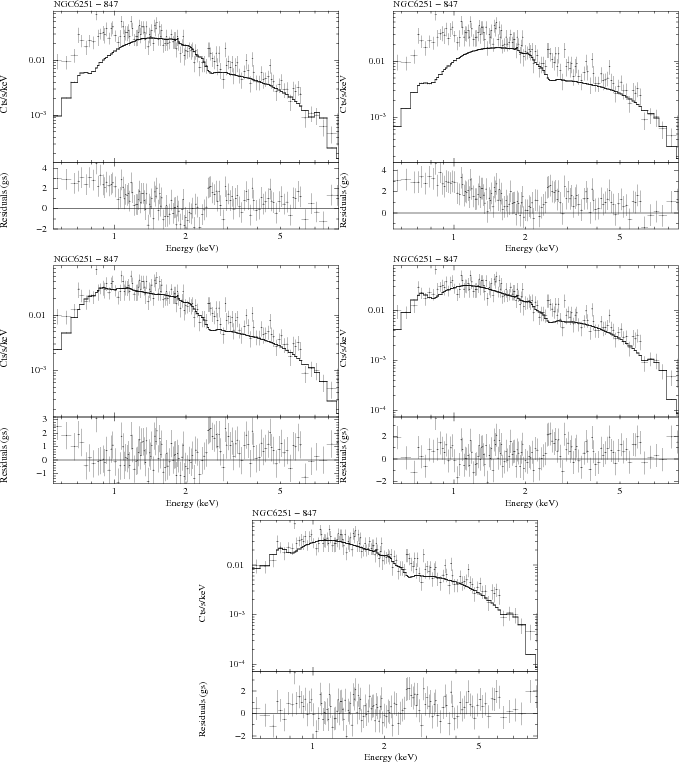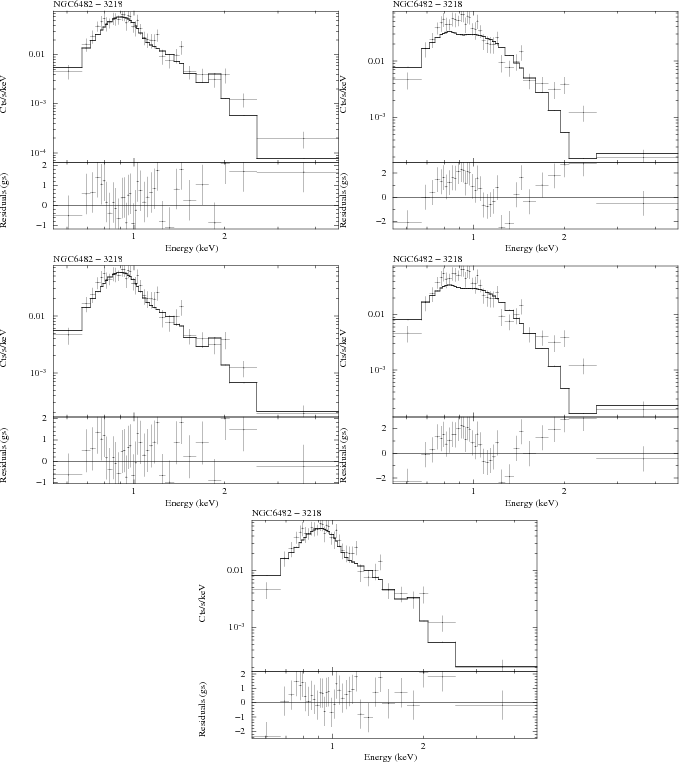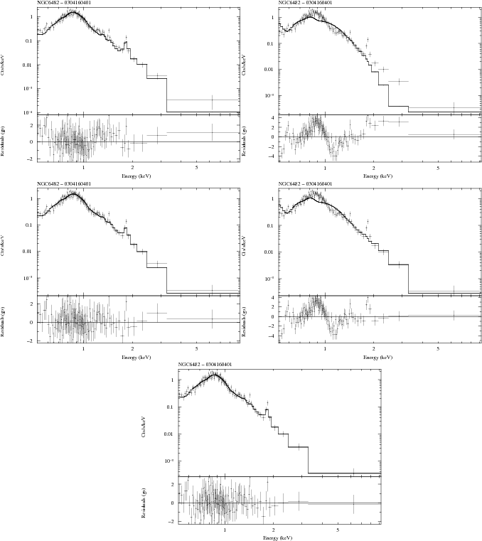Figure E.43: Spectral fits of NGC6482. (Top-left): Thermal model (MEKAL), (Top-right): Power-law model, (Center-left): Power-law plus thermal model, (Center-right): Two power-law model, (Bottom): Two power-law plus thermal model. |