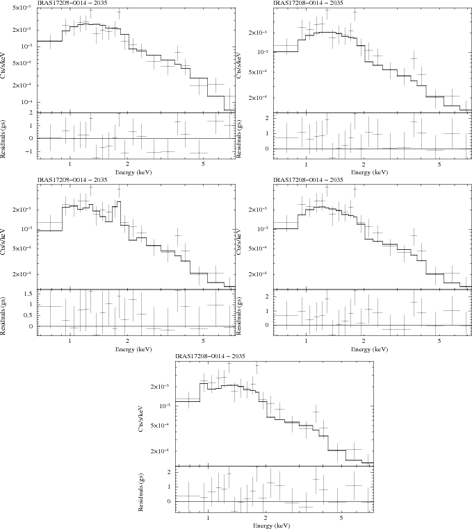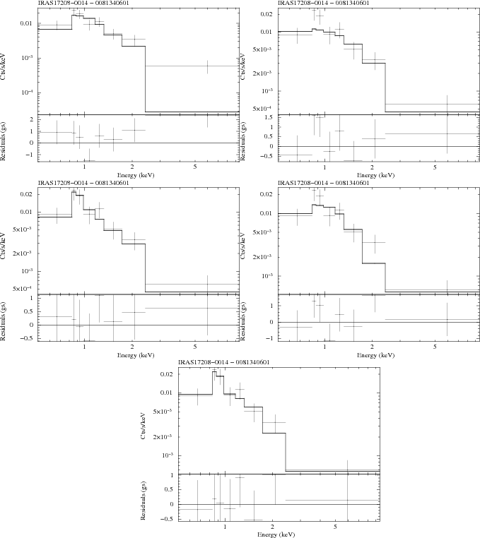Figure D.41: Spectral fits of IRAS 17208-0014. (Top-left): Thermal model (MEKAL), (Top-right): Power-law model, (Center-left): Power-law plus thermal model, (Center-right): Two power-law model, (Bottom): Two power-law plus thermal model. |