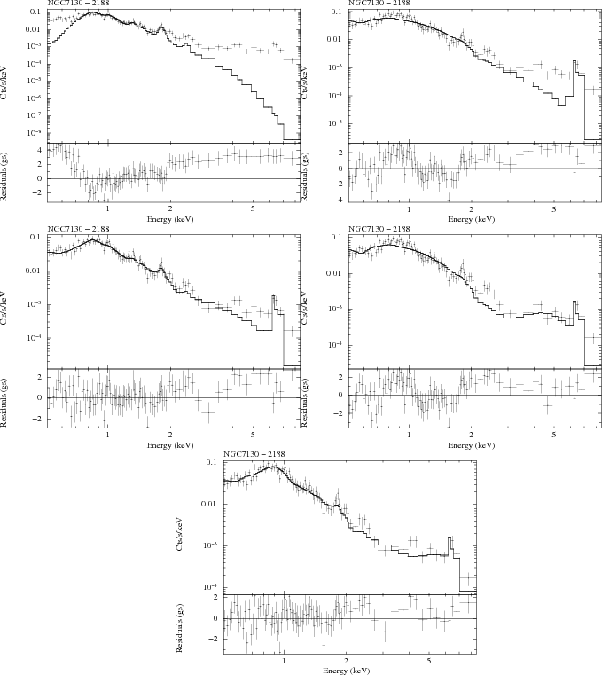 Figure D.43: Spectral fits of NGC7130. (Top-left): Thermal model (MEKAL), (Top-right): Power-law model, (Center-left): Power-law plus thermal model, (Center-right): Two power-law model, (Bottom): Two power-law plus thermal model. |