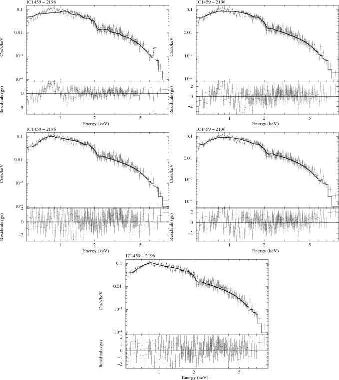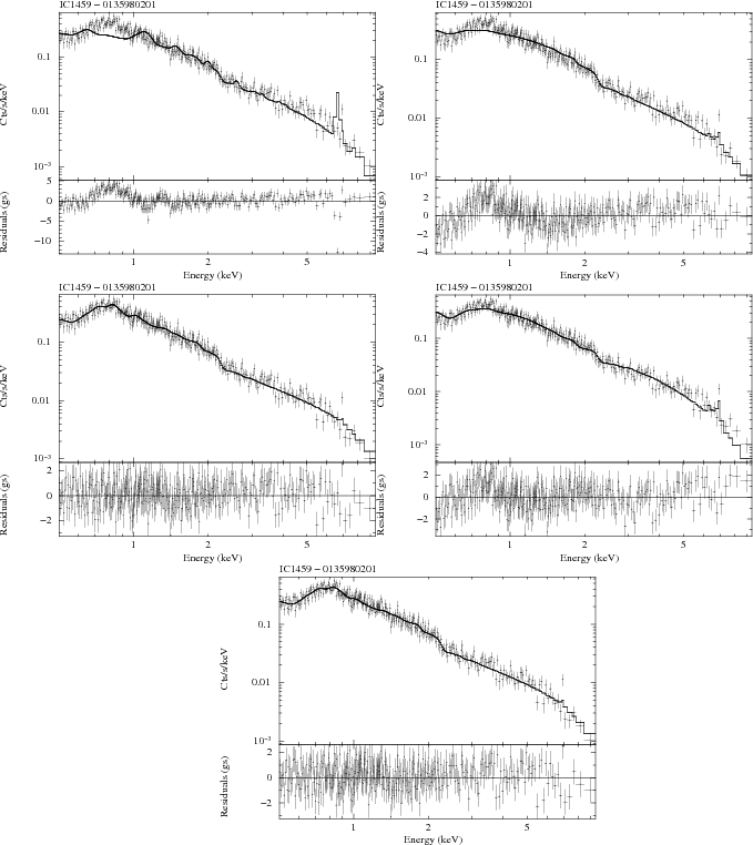 Figure E.45: Spectral fits of IC1459. (Top-left): Thermal model (MEKAL), (Top-right): Power-law model, (Center-left): Power-law plus thermal model, (Center-right): Two power-law model, (Bottom): Two power-law plus thermal model. |