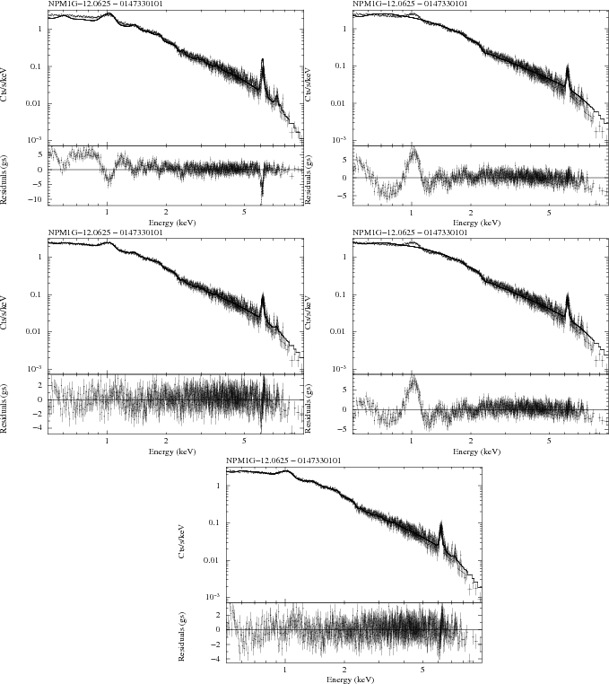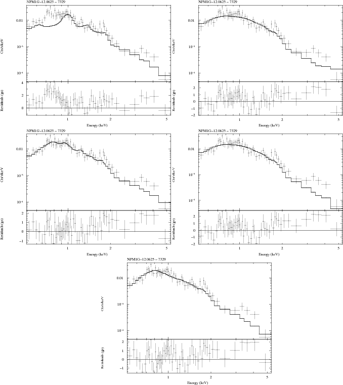 Figure E.46: Spectral fits of NPM1G -12.0625. (Top-left): Thermal model (MEKAL), (Top-right): Power-law model, (Center-left): Power-law plus thermal model, (Center-right): Two power-law model, (Bottom): Two power-law plus thermal model. |