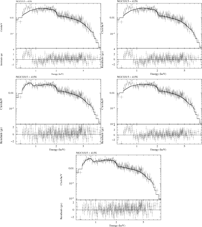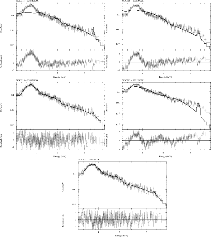 Figure E.1: Spectral fits of NGC315. (Top-left): Thermal model (MEKAL), (Top-right): Power-law model, (Center-left): Power-law plus thermal model, (Center-right): Two power-law model, (Bottom): Two power-law plus thermal model. |