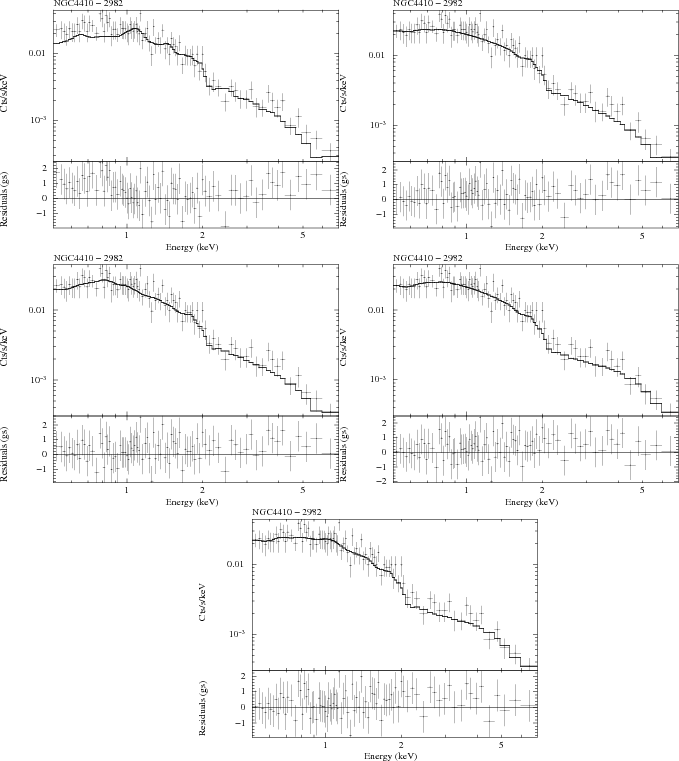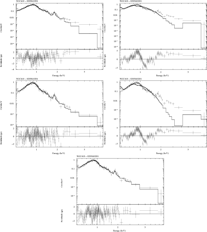 Figure E.2: Spectral fits of NGC410. (Top-left): Thermal model (MEKAL), (Top-right): Power-law model, (Center-left): Power-law plus thermal model, (Center-right): Two power-law model, (Bottom): Two power-law plus thermal model. |
