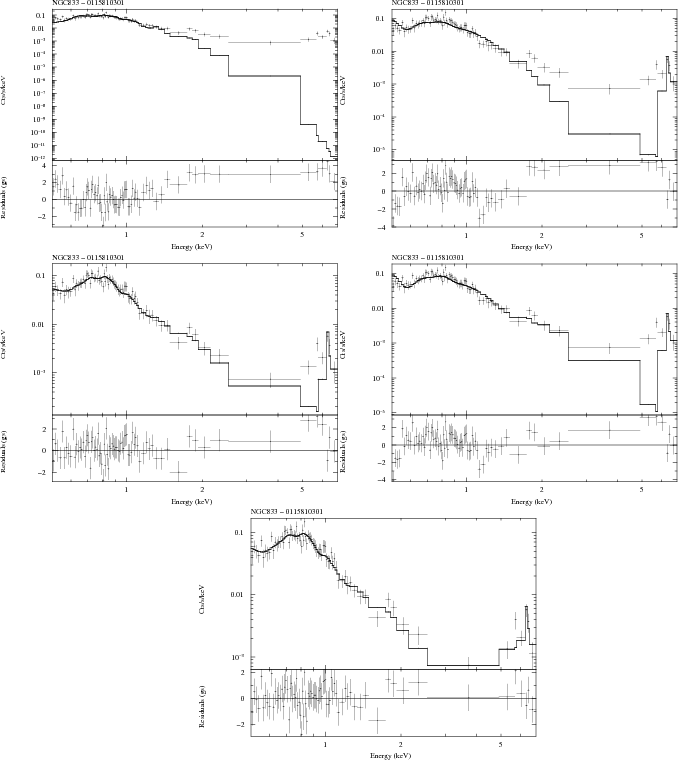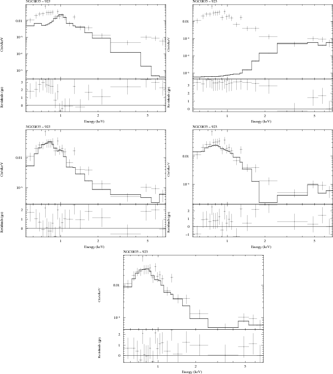 Figure E.3: Spectral fits of NGC835. (Top-left): Thermal model (MEKAL), (Top-right): Power-law model, (Center-left): Power-law plus thermal model, (Center-right): Two power-law model, (Bottom): Two power-law plus thermal model. |
