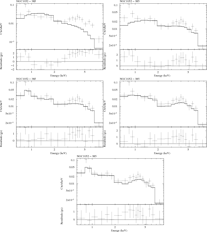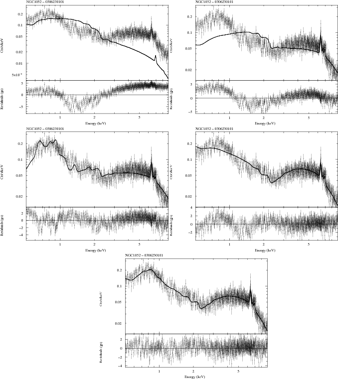 Figure E.4: Spectral fits of NGC1052. (Top-left): Thermal model (MEKAL), (Top-right): Power-law model, (Center-left): Power-law plus thermal model, (Center-right): Two power-law model, (Bottom): Two power-law plus thermal model. |