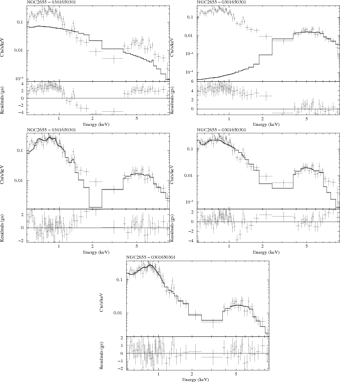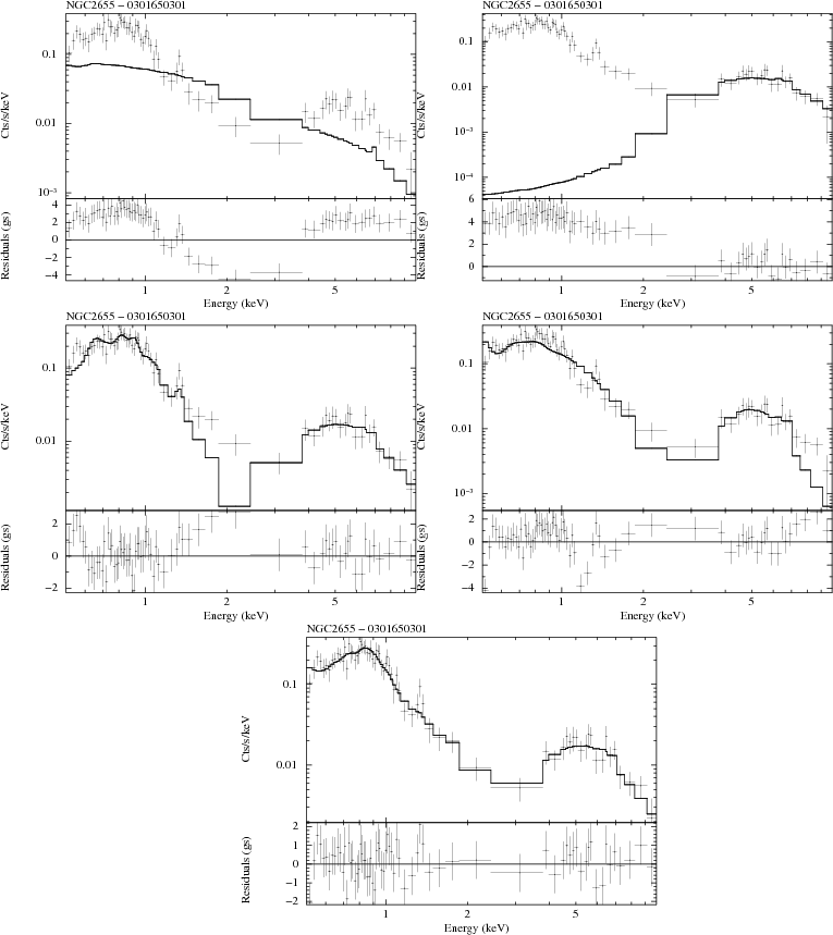 Figure E.6: Spectral fits of NGC2655. (Top-left): Thermal model (MEKAL), (Top-right): Power-law model, (Center-left): Power-law plus thermal model, (Center-right): Two power-law model, (Bottom): Two power-law plus thermal model. |