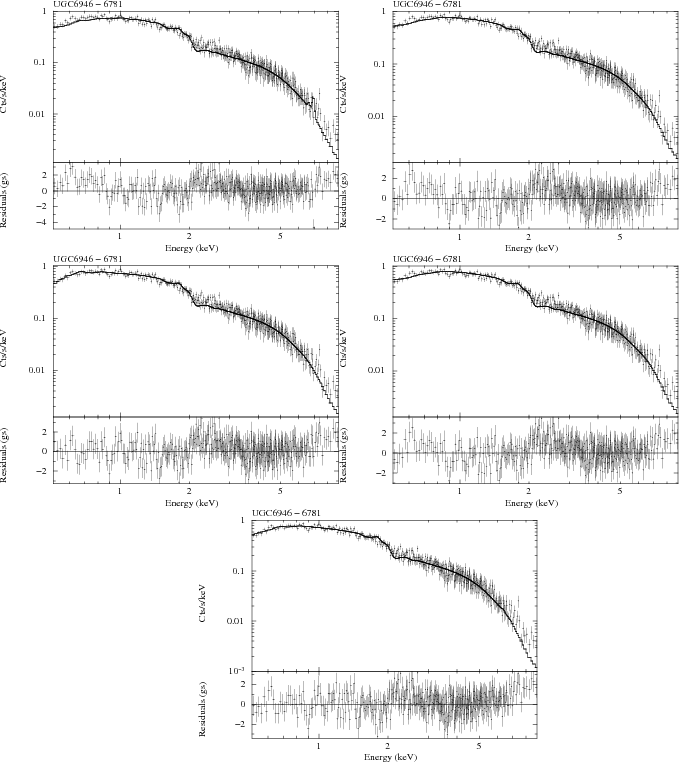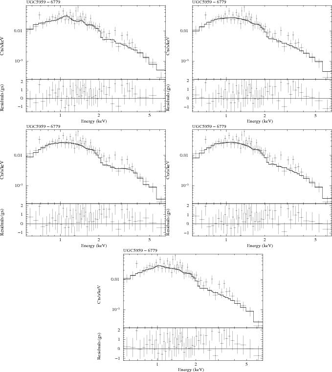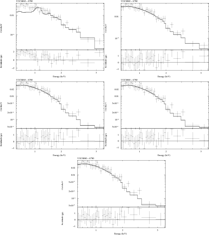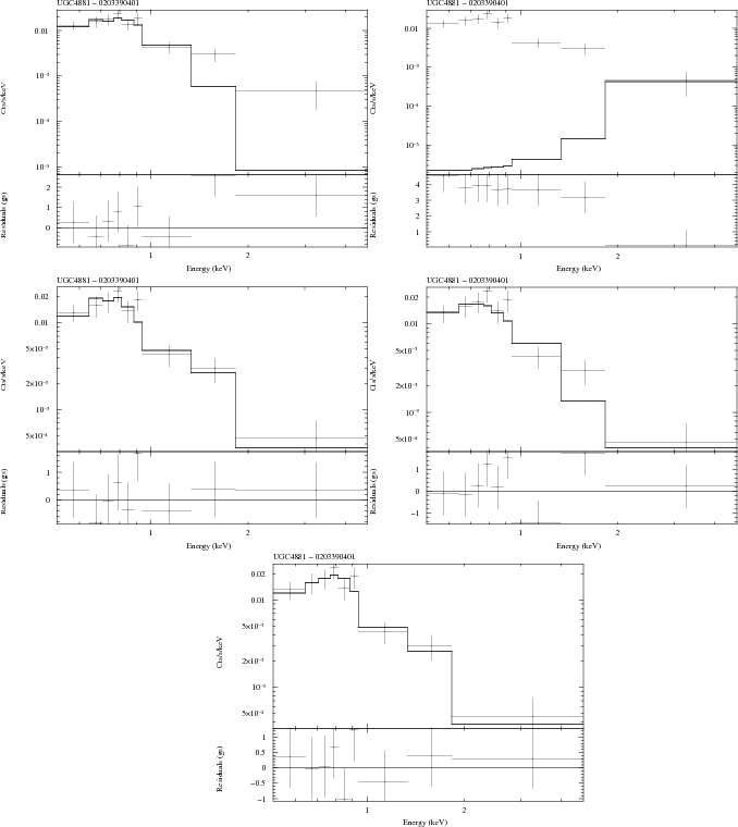 Figure E.7: Spectral fits of UGC4881. (Top-left): Thermal model (MEKAL), (Top-right): Power-law model, (Center-left): Power-law plus thermal model, (Center-right): Two power-law model, (Bottom): Two power-law plus thermal model. |