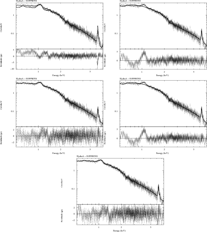 Figure E.8: Spectral fits of HydraA. (Top-left): Thermal model (MEKAL), (Top-right): Power-law model, (Center-left): Power-law plus thermal model, (Center-right): Two power-law model, (Bottom): Two power-law plus thermal model. |