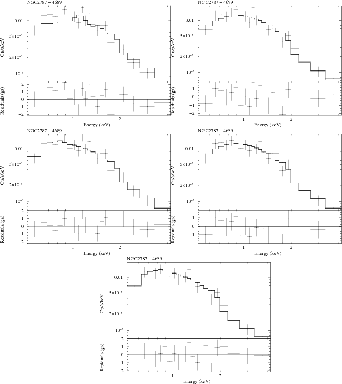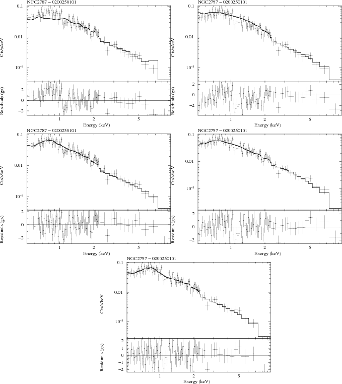 Figure E.9: Spectral fits of NGC2787. (Top-left): Thermal model (MEKAL), (Top-right): Power-law model, (Center-left): Power-law plus thermal model, (Center-right): Two power-law model, (Bottom): Two power-law plus thermal model. |