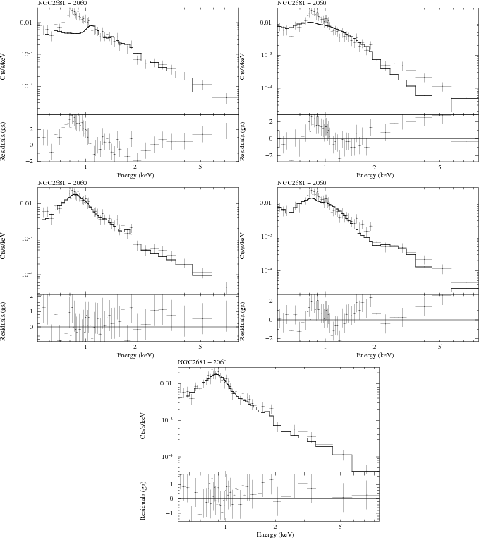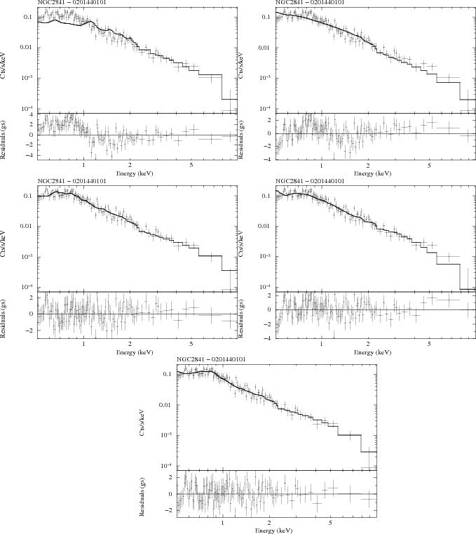 Figure E.10: Spectral fits of NGC2841. (Top-left): Thermal model (MEKAL), (Top-right): Power-law model, (Center-left): Power-law plus thermal model, (Center-right): Two power-law model, (Bottom): Two power-law plus thermal model. |