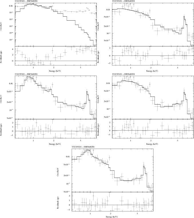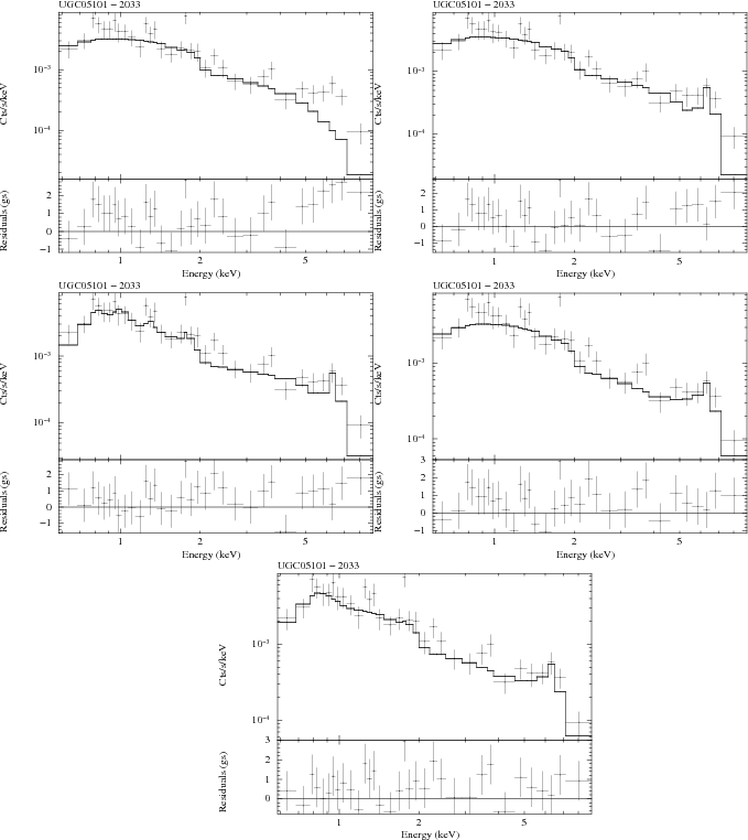 Figure E.11: Spectral fits of UGC05101. (Top-left): Thermal model (MEKAL), (Top-right): Power-law model, (Center-left): Power-law plus thermal model, (Center-right): Two power-law model, (Bottom): Two power-law plus thermal model. |