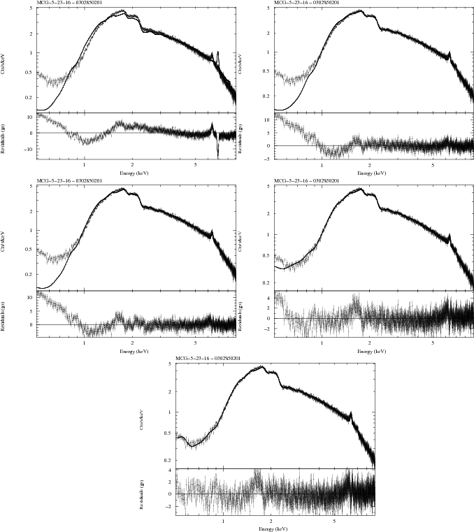 Figure E.12: Spectral fits of MCG -5-23-16. (Top-left): Thermal model (MEKAL), (Top-right): Power-law model, (Center-left): Power-law plus thermal model, (Center-right): Two power-law model, (Bottom): Two power-law plus thermal model. |