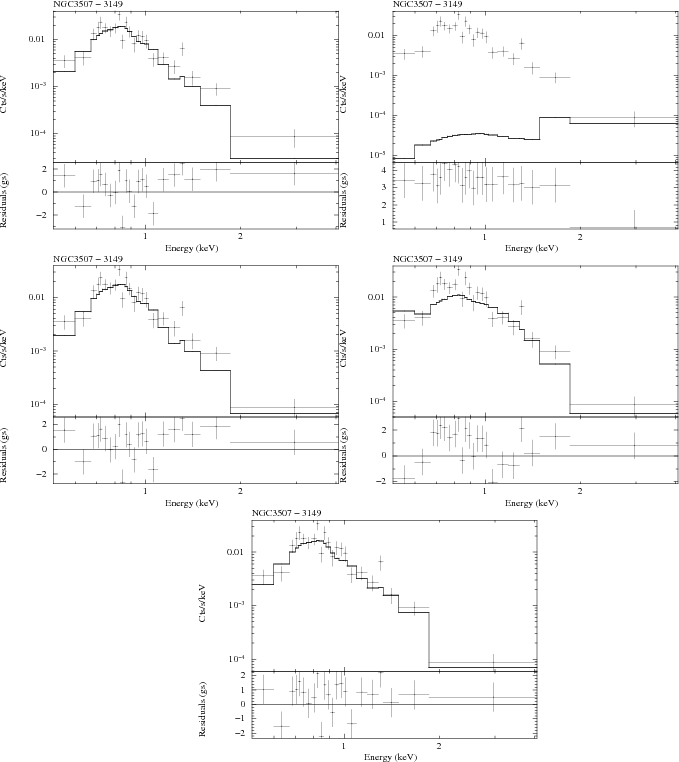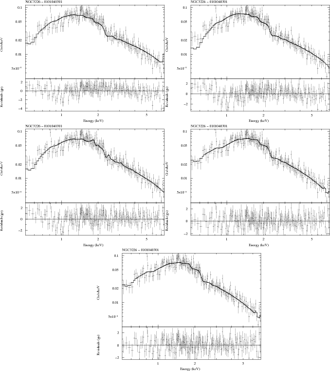 Figure E.13: Spectral fits of NGC3226. (Top-left): Thermal model (MEKAL), (Top-right): Power-law model, (Center-left): Power-law plus thermal model, (Center-right): Two power-law model, (Bottom): Two power-law plus thermal model. |