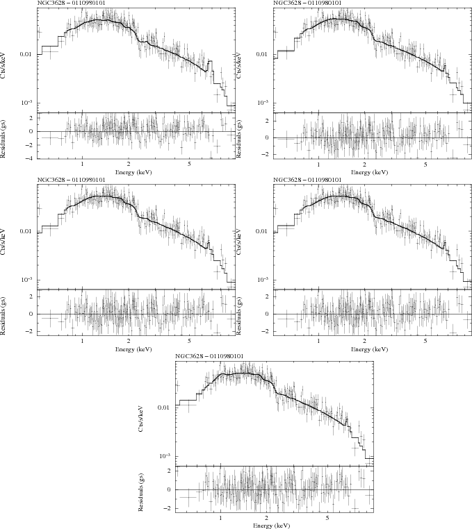 Figure E.14: Spectral fits of NGC3628. (Top-left): Thermal model (MEKAL), (Top-right): Power-law model, (Center-left): Power-law plus thermal model, (Center-right): Two power-law model, (Bottom): Two power-law plus thermal model. |