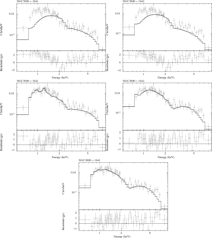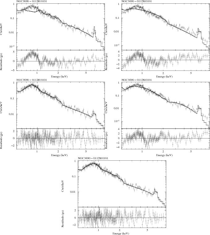 Figure E.15: Spectral fits of NGC3690. (Top-left): Thermal model (MEKAL), (Top-right): Power-law model, (Center-left): Power-law plus thermal model, (Center-right): Two power-law model, (Bottom): Two power-law plus thermal model. |