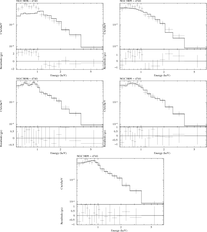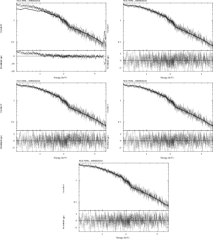 Figure E.16: Spectral fits of NGC3998. (Top-left): Thermal model (MEKAL), (Top-right): Power-law model, (Center-left): Power-law plus thermal model, (Center-right): Two power-law model, (Bottom): Two power-law plus thermal model. |