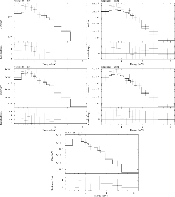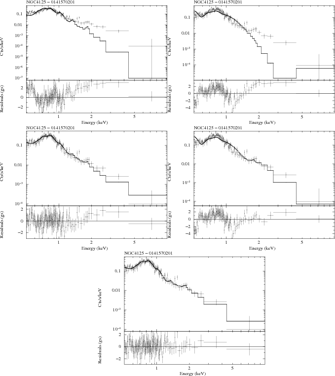 Figure E.17: Spectral fits of NGC4125. (Top-left): Thermal model (MEKAL), (Top-right): Power-law model, (Center-left): Power-law plus thermal model, (Center-right): Two power-law model, (Bottom): Two power-law plus thermal model. |