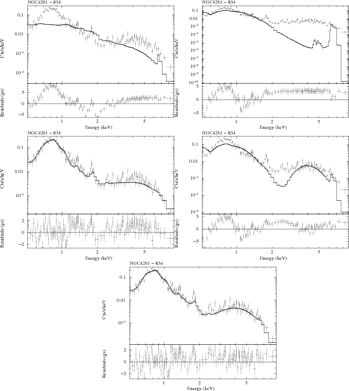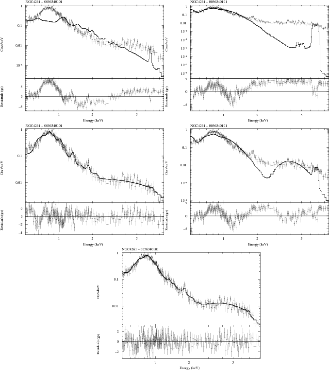 Figure E.18: Spectral fits of NGC4261. (Top-left): Thermal model (MEKAL), (Top-right): Power-law model, (Center-left): Power-law plus thermal model, (Center-right): Two power-law model, (Bottom): Two power-law plus thermal model. |